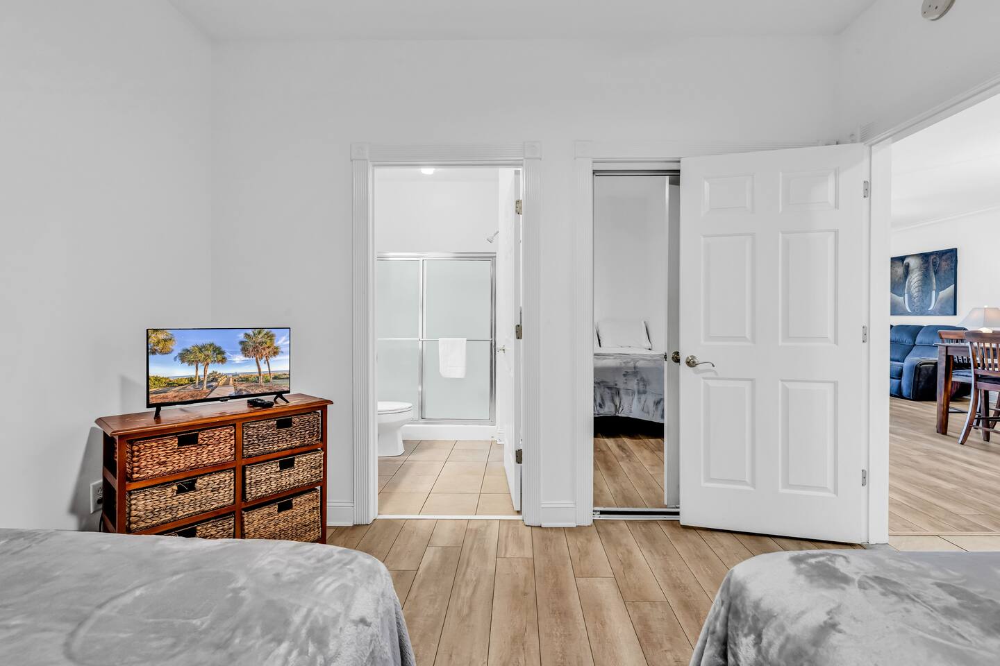 Ground floor 2 bedroom and 2 full bathroom condo with direct access to the pool. Master bedroom with 1 KING size bed & 1 double bed. 2nd bedroom with 2 double beds. 2 full bathroom with washer and dryer free. HDTV living room & Master bedroom . Free Internet Wi-Fi. Free parking in front of the building. Access to 7 outside pools & BBQ stations. NO CARPET. Easy access to the beach, Broadway at the Beach with restaurants, shopping & entertainment for all ages.